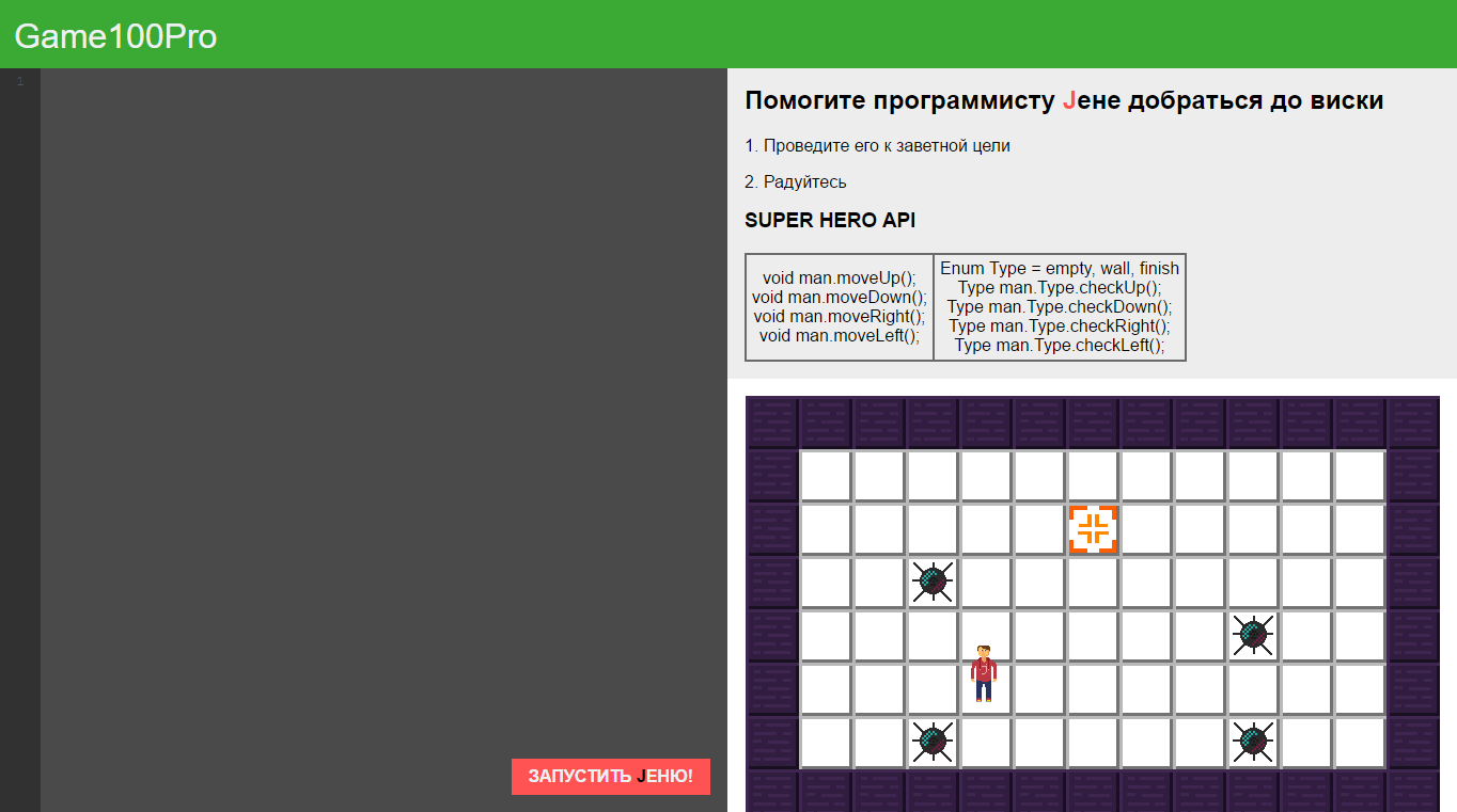 Год назад я участвовал в EPAM HackDay, где наша команда решила делать обучающую Java игру, естественно писать решили на Java. Идея проста — у игрока есть поле с юнитом и задание, которое нужно выполнить. Он пишет некий код, который передвигает юнита и ведёт его к цели. В рамках хакдея мы сделали прототип с одним заданием, где нужно было просто привести юнита к финишу.
